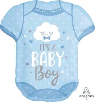 Bring your party to life with this Baby Boy Onesie Giant Super Shaped Foil Balloon. This Anagram balloon is perfect for using in a themed balloon bouquet. Pair with some of our other foil mylar and latex balloons for a great design! This balloon includes a self-sealing valve, preventing the gas from escaping after it's inflated. The balloon can be inflated with helium to float or with a balloon air inflator. Balloon arrives uninflated.