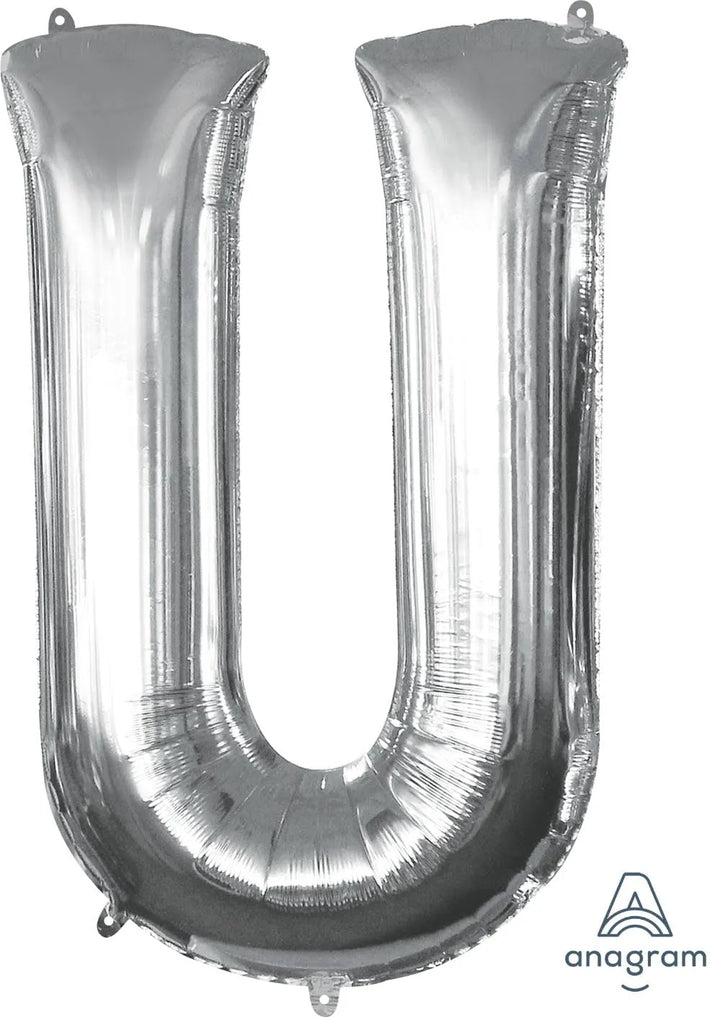 Our Letter Silver U, Giant Letter Shaped 86cm 34" Foil Balloons are the ultimate way to celebrate someone's birthday, a business grand opening or for marketing a new product at a trade show! Spell out the person's name or product name and either inflate them with helium to have them float or with air to not have them float and attach them to the wall. These huge balloons are great for bouquets, photo backdrops, on the top of balloon columns, design them into the top of balloon arches and more. Add color coordinating mylars and latex balloons for the ultimate balloon bouquet! This balloon includes a self-sealing valve, preventing the gas from escaping after it's inflated. Balloon arrives uninflated.