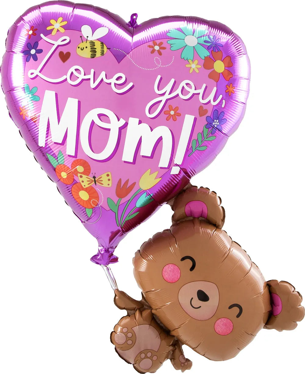 Bring your party to life with this Love You Mom Bear Giant Super Shaped Foil Balloon. This Anagram balloon is perfect for using in a themed balloon bouquet. Pair with some of our other foil mylar and latex balloons for a great design! This balloon includes a self-sealing valve, preventing the gas from escaping after it's inflated. The balloon can be inflated with helium to float or with a balloon air inflator. Balloon arrives uninflated.