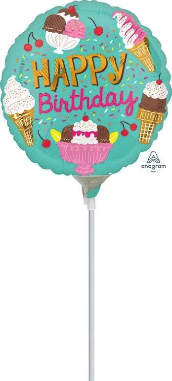 This Icecream Party HBD 9 Inch 23cm Mini Air Fill Balloon with Stick (Air Fill Only) is great for any themed centerpiece or gift basket or can be used as an add-on accessory piece to balloon decor. Balloon must be inflated with air only using a hand pump and sealed using a heat sealer. Balloon does not float and ships un-inflated. Cup and Stick included. Balloon can be used with or without Cup and Sticks.