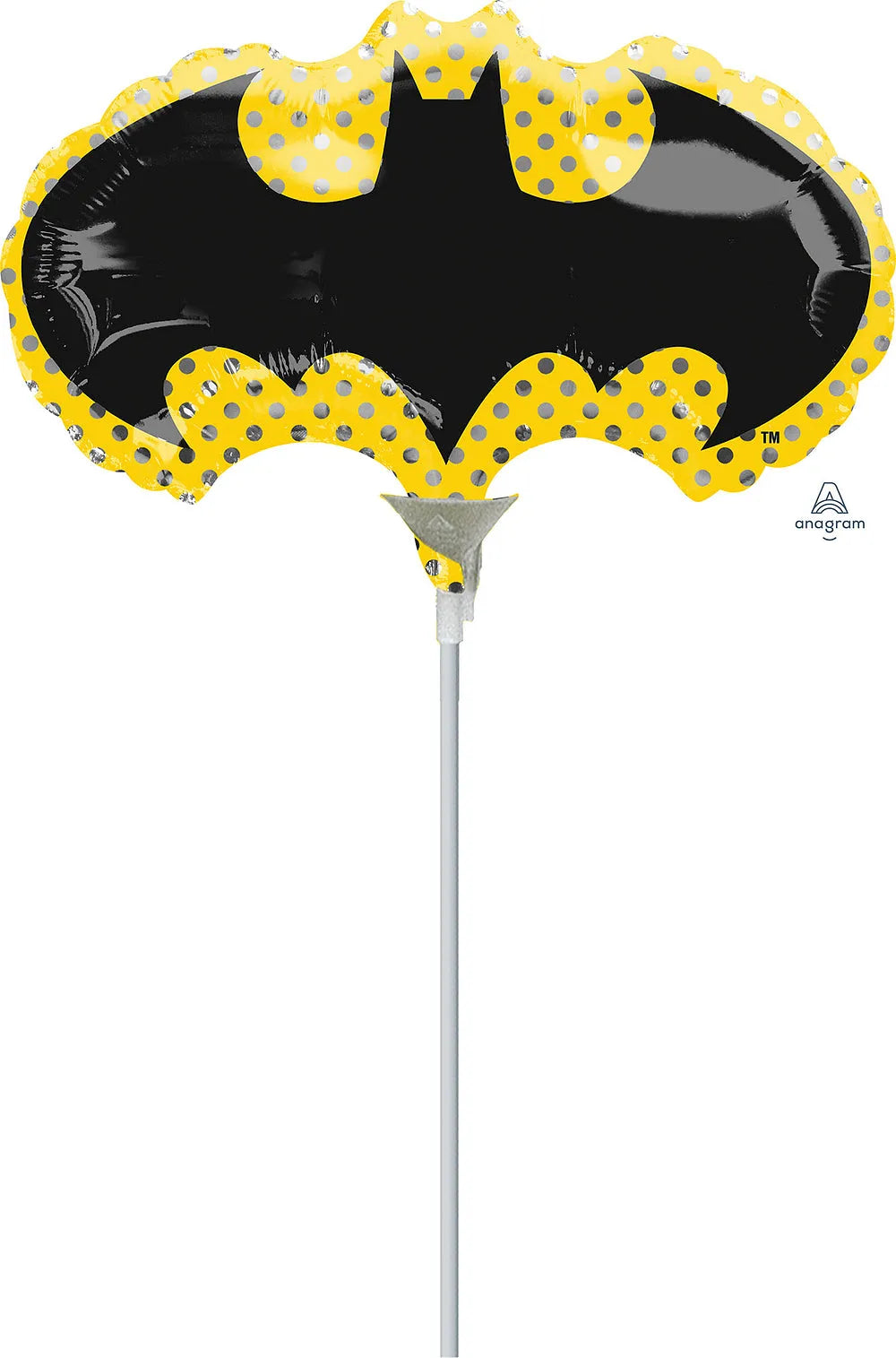 This Batman 35cm 14 Inch Mini Air Fill Foil Balloon with Stick (Air Fill Only) is great for any themed centerpiece or gift basket or can be used as an add-on accessory piece to balloon decor. Balloon must be inflated with air only using a hand pump and sealed using a heat sealer. Balloon does not float and ships un-inflated. Cup and Stick included. Balloon can be used with or without Cup and Sticks.