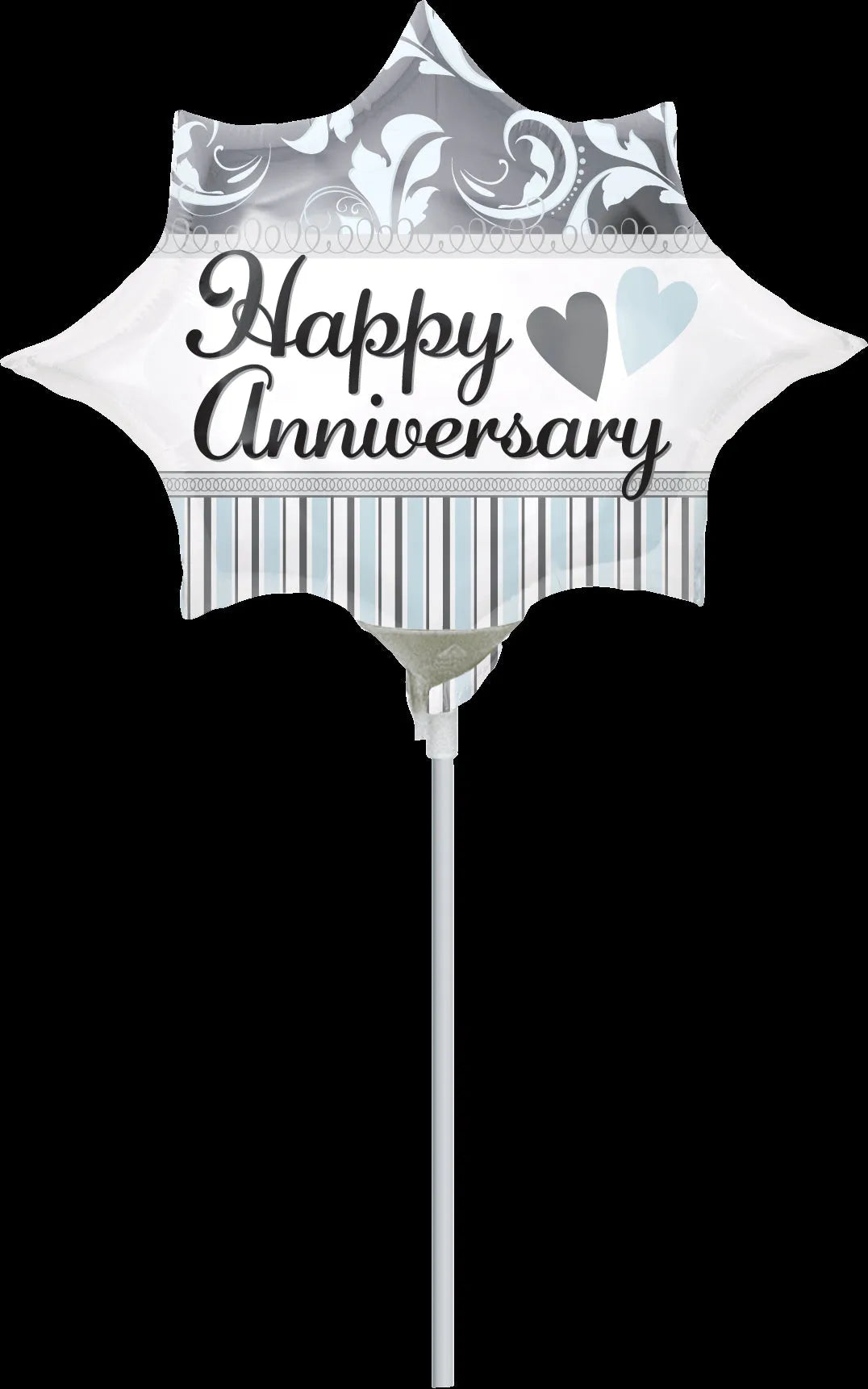 This Elegant Anniversary Burst 35cm 14 Inch Mini Air Fill Foil Balloon with Stick (Air Fill Only) is great for any themed centerpiece or gift basket or can be used as an add-on accessory piece to balloon decor. Balloon must be inflated with air only using a hand pump and sealed using a heat sealer. Balloon does not float and ships un-inflated. Cup and Stick included. Balloon can be used with or without Cup and Sticks.