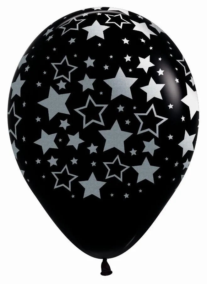 These Printed Bold Stars Fashion Metallic Ink on Black Latex Balloons, Sempertex 12 Inch 30cm Balloons 50 Pack are perfect for making balloon arches, balloon columns, balloon clusters, and other balloon decorations. Color coordinate these latex balloons with themed foil mylar balloons for the ultimate balloon bouquet! The balloons can be inflated with helium to float. Balloons arrives uninflated.