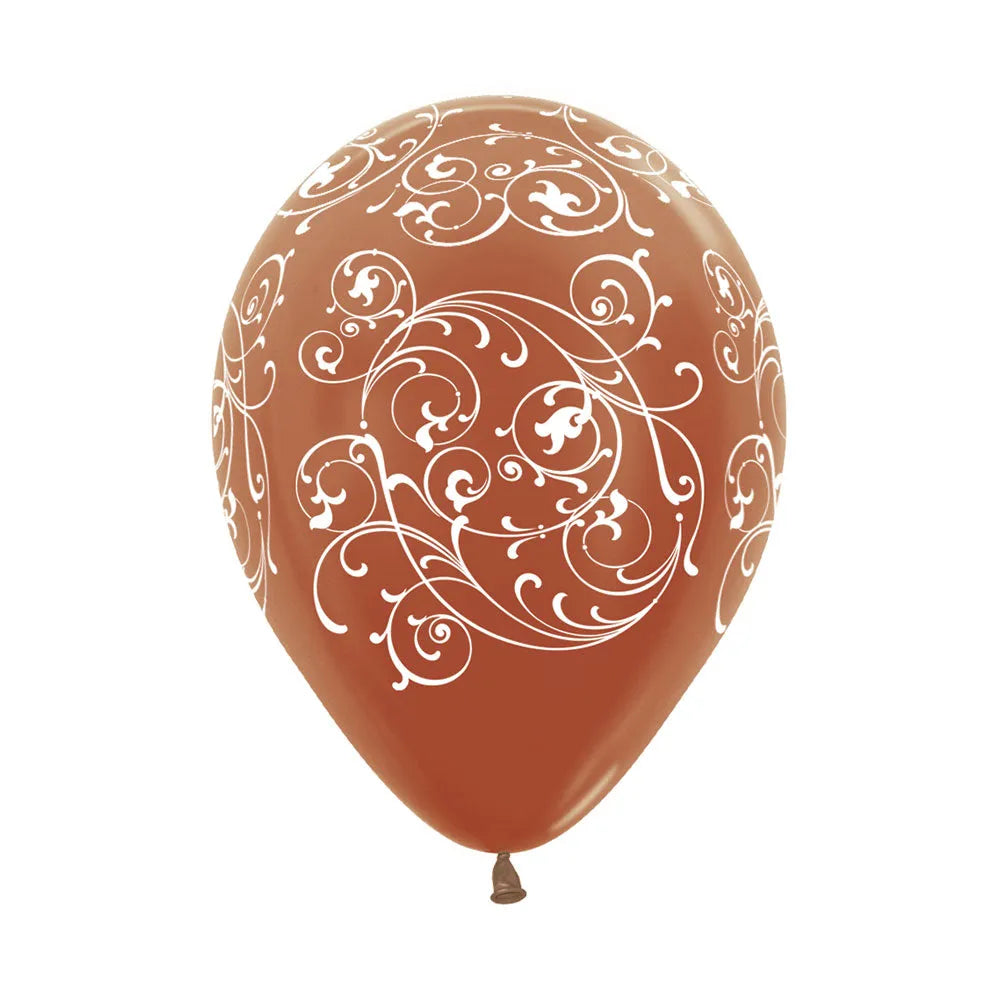 These Printed Filigree Metallic Copper All Over Print Latex Balloons, Sempertex 12 Inch 30cm Balloons 50 Pack are perfect for making balloon arches, balloon columns, balloon clusters, and other balloon decorations. Color coordinate these latex balloons with themed foil mylar balloons for the ultimate balloon bouquet! The balloons can be inflated with helium to float. Balloons arrives uninflated.