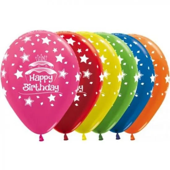 Printed Happy Birthday Cake Metallic Assorted All Over Print Latex Balloons, Sempertex 12 Inch 30cm Balloons 50 Pack