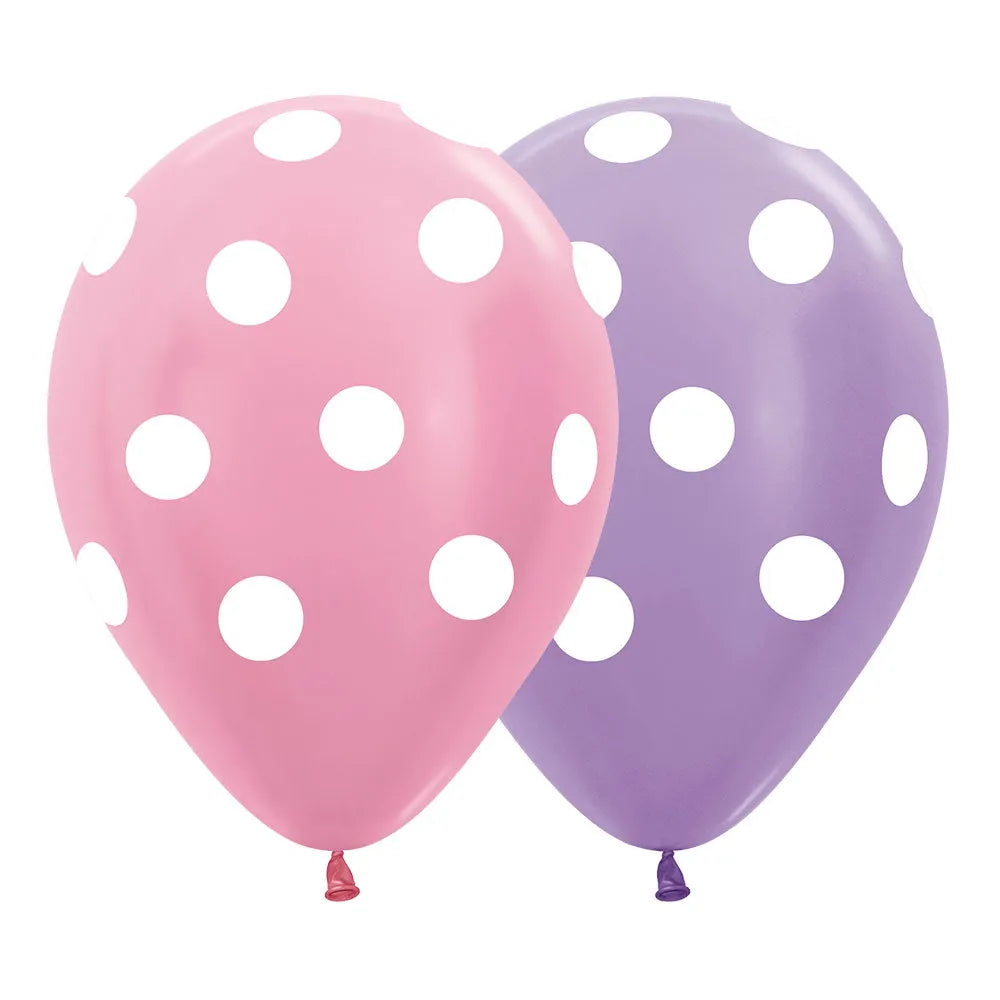 These Printed Polka Dot Girl Satin Assorted All Over Print Latex Balloons, Sempertex 12 Inch 30cm Balloons 50 Pack are perfect for making balloon arches, balloon columns, balloon clusters, and other balloon decorations. Color coordinate these latex balloons with themed foil mylar balloons for the ultimate balloon bouquet! The balloons can be inflated with helium to float. Balloons arrives uninflated.