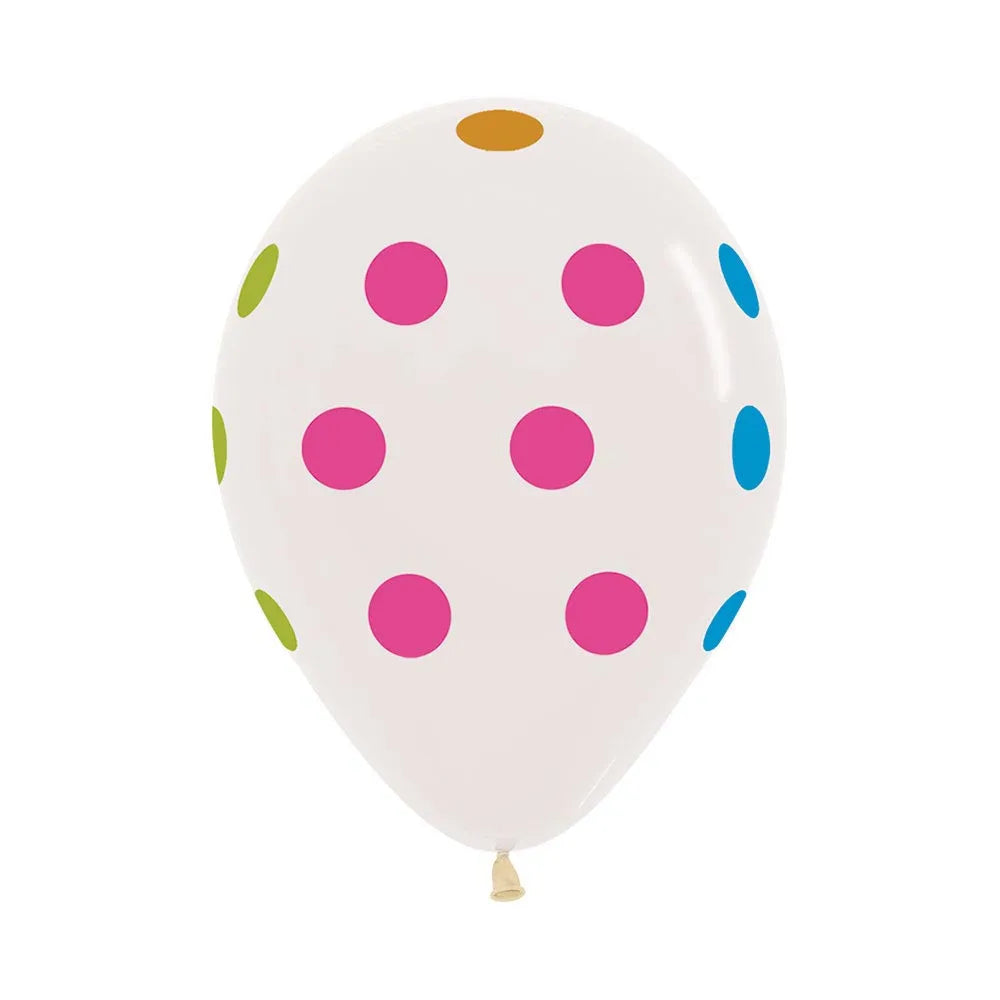 These Printed Polka Neon Assorted on Cry Clear All Over Print Latex Balloons, Sempertex 12 Inch 30cm Balloons 50 Pack are perfect for making balloon arches, balloon columns, balloon clusters, and other balloon decorations. Color coordinate these latex balloons with themed foil mylar balloons for the ultimate balloon bouquet! The balloons can be inflated with helium to float. Balloons arrives uninflated.