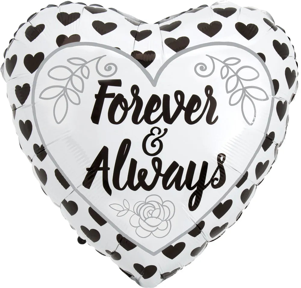 Accent your party decor with this Forever & Always Black & White ,45cm 18 Inch Standard Foil Balloon. Incorporate this balloon into a balloon bouquet, on top of balloon columns or other balloon decor. Add color coordinating mylars and latex balloons for the ultimate balloon bouquet! This balloon is printed / coloured on both sides includes a self-sealing valve, preventing the gas from escaping after it's inflated. The balloon can be inflated with helium to float or with a balloon air inflator to hang. Balloon arrives uninflated.