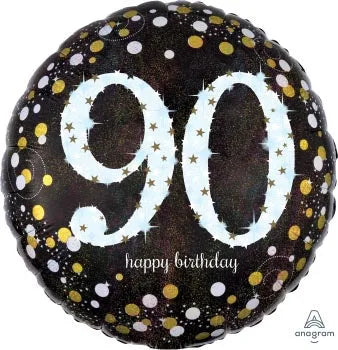 Accent your party decor with this Holographic Sparkling Birthday 90 ,45cm 18 Inch Standard Foil Balloon. Incorporate this balloon into a balloon bouquet, on top of balloon columns or other balloon decor. Add color coordinating mylars and latex balloons for the ultimate balloon bouquet! This balloon is printed / coloured on both sides includes a self-sealing valve, preventing the gas from escaping after it's inflated. The balloon can be inflated with helium to float or with a balloon air inflator to hang. Balloon arrives uninflated.