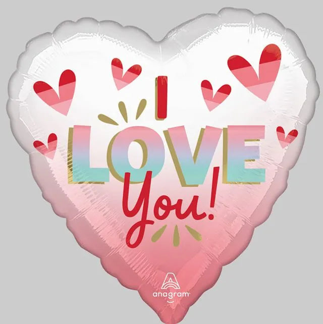 Accent your party decor with this I Love You Diffused Ombre ,45cm 18 Inch Standard Foil Balloon. Incorporate this balloon into a balloon bouquet, on top of balloon columns or other balloon decor. Add color coordinating mylars and latex balloons for the ultimate balloon bouquet! This balloon is printed / coloured on both sides includes a self-sealing valve, preventing the gas from escaping after it's inflated. The balloon can be inflated with helium to float or with a balloon air inflator to hang. Balloon arrives uninflated.