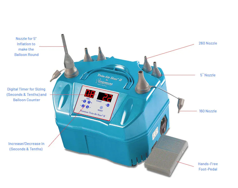 The Premium Twin-Air Sizer® II digitally and accurately inflates all latex balloons.